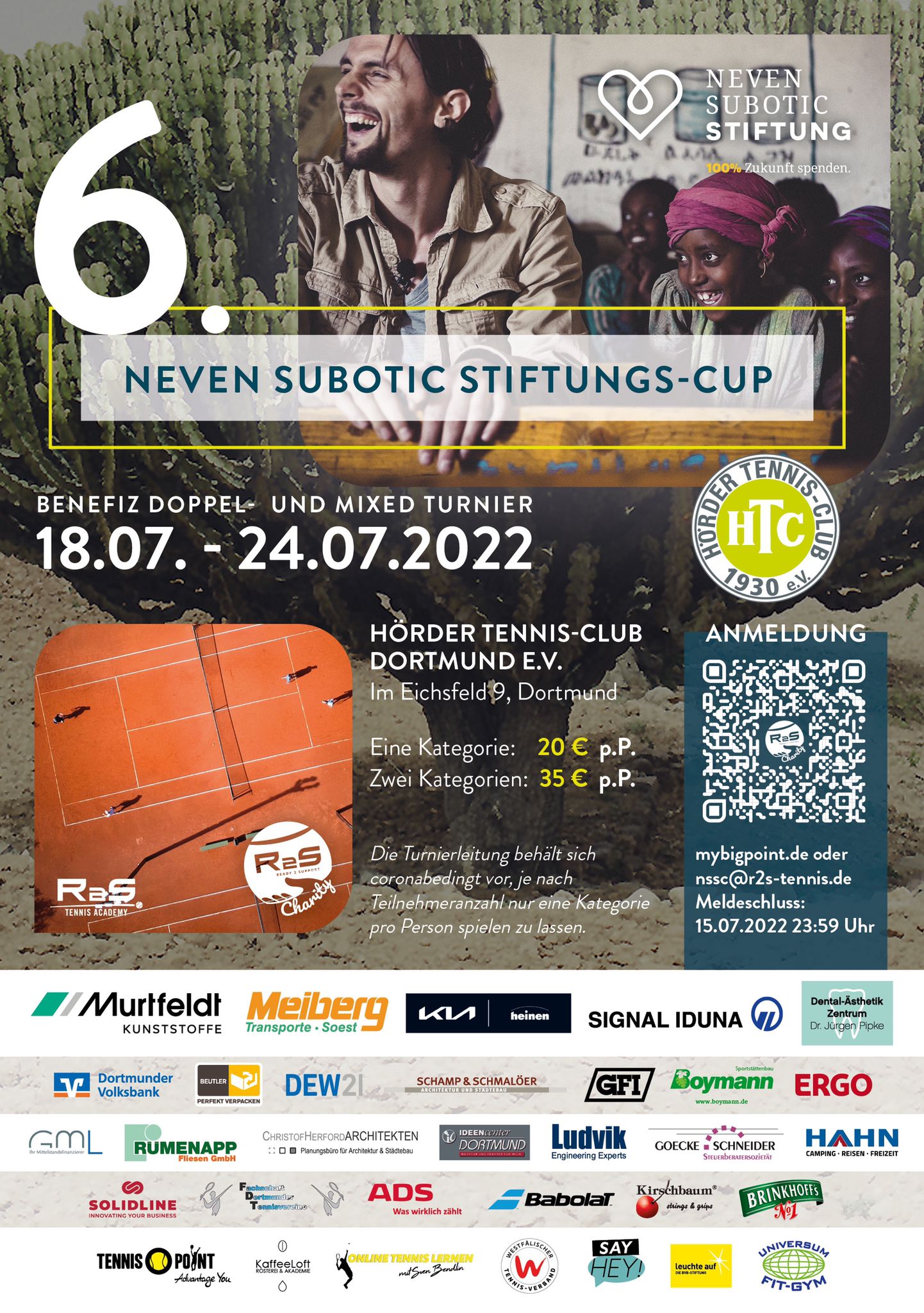 Gleichzeitig erfüllt der „Neven Subotic Stiftungs Cup“ seit 6 Jahren einen wohltätigen Zweck. Neben den Turnierkosten wird ein großer Teil der Einnahmen der Neven Subotic Stiftung gespendet, die mit den Spendengeldern der bisherigen Turniere (2016-2021) mehrere lebenswichtige Trinkwasserbrunnen in Äthiopien bauen lassen konnte. Der Rekord aus dem letzten Jahr, eine Spendensummer von über 18000€, soll auch in diesem Jahr wieder geknackt werden. Ein Träumchen wäre wenn eine 2 vor dem Komma steht, so Mitorganisator und Geschäftsführer der R2S Tennis Academy, Sven Bendlin. Wer dieses Turnierflair einmal erlebt hat, der kommt immer wieder, getreu dem Motto „Freunde begrüßen Freunde“, so Sven weiter.